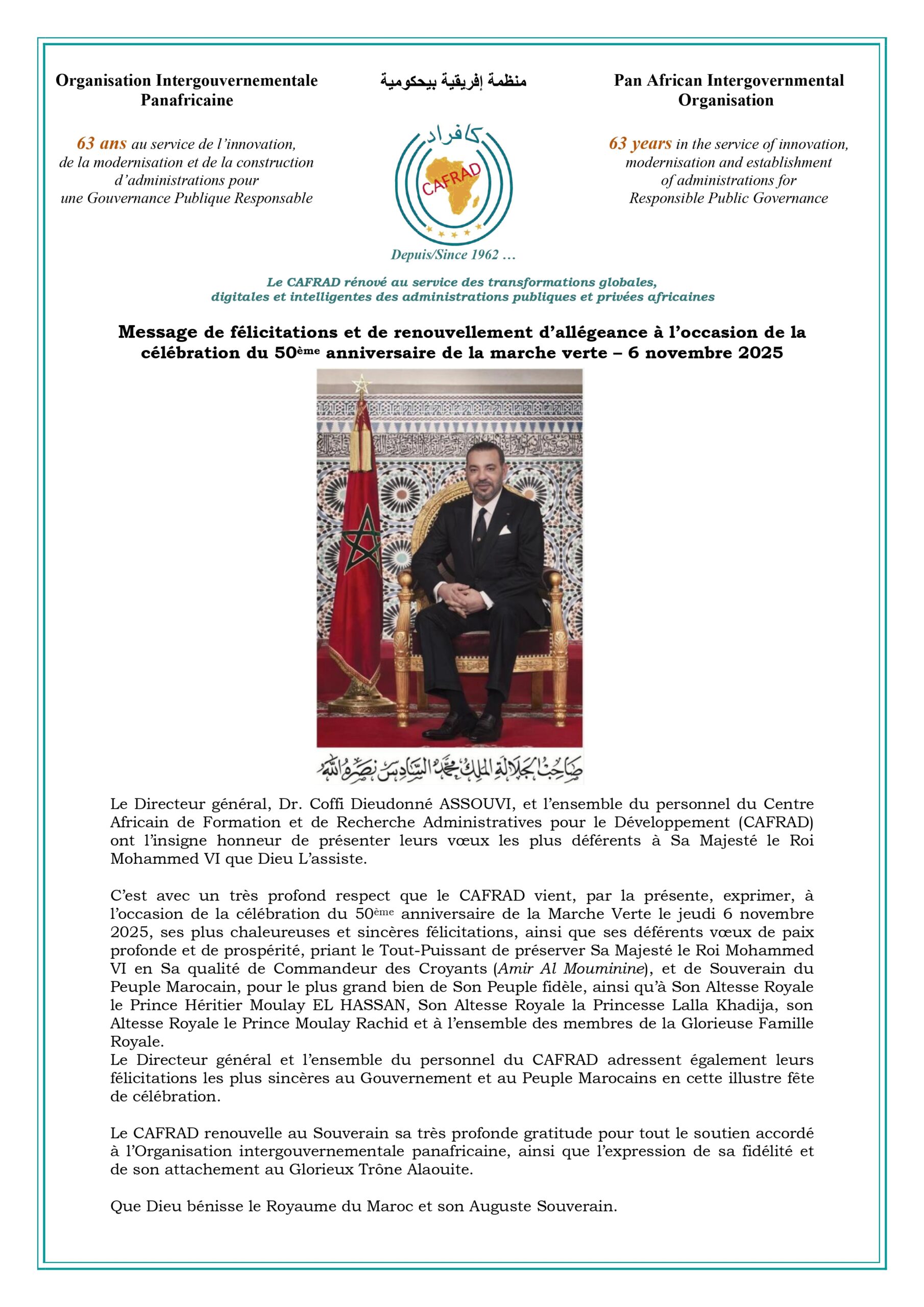 HomeACTUALITÉSActualitésMessage de félicitations et de renouvellement d’allégeance à l’occasion de la célébration du 50ème anniversaire de la marche verte – 6 novembre 2025